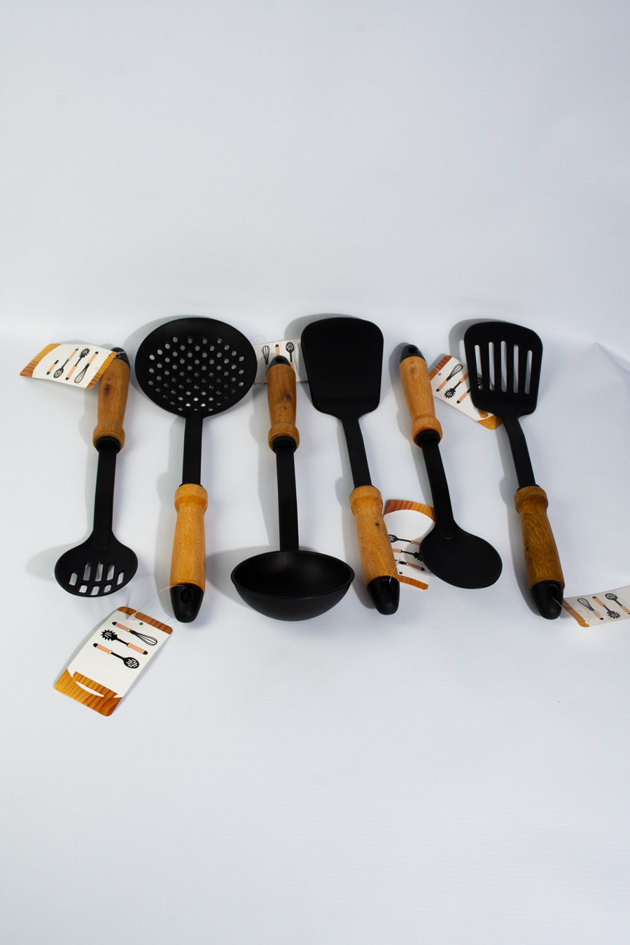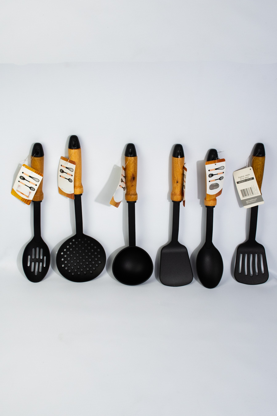 Nuestro kit incluye: 1 cuchara calada, 1 cucharon, 1 cuchara, 1 espátula, 1 espátula calada y 1 espumadera, son las herramientas ideales para cocinar y servir tus platos favoritos. con mango de acero inoxidable y cabeza de nylon resistente al calor la hacen perfecta para uso diario.